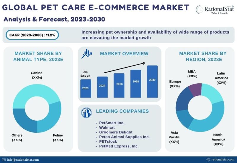 - According to a deep-dive market assessment by RationalStat, the global Pet Care E-commerce market has been analyzed on the basis of market segments, including animal type, product, and geography/regions (including North America, Latin America, Western Europe, Eastern Europe, Middle East & Africa, and Asia Pacific). The report also offers global and regional market sizing for the historical period of 2019-2022 and the forecast period of 2023-2030.